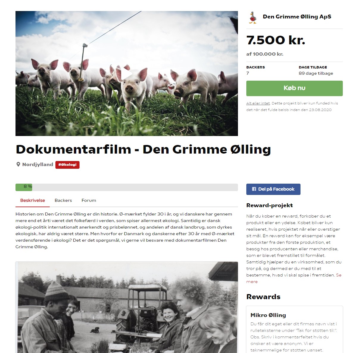 Historien om Den Grimme Ølling er ikke bare historien om økologisk mad og landbrug. Efter 30 år med det røde Ø-mærke og en position som verdens mest økospisende nation, er Den Grimme Ølling også din historie som dansker. Vi vil derfor gerne give dig muligheden for at støtte projektets tilblivelse, og derfor lancerer vi nu en 90 dages crowdfunding-kampagne, hvor du kan være med til at hjælpe Øllingen i mål. Som ”backer” af projektet modtager du som minimum en version af den endelige film til download, og alt efter temperament, smag og pengepung er der også Vesterhavsost fra Thise Mejeri, økologisk øl fra Thisted Bryghus og t-shirts med Øllingelogo i økologisk bomuld blandt de mange forskellige rewards. Man kan være med fra 250 kroner og opefter. Vi håber, du har lyst til at være med.